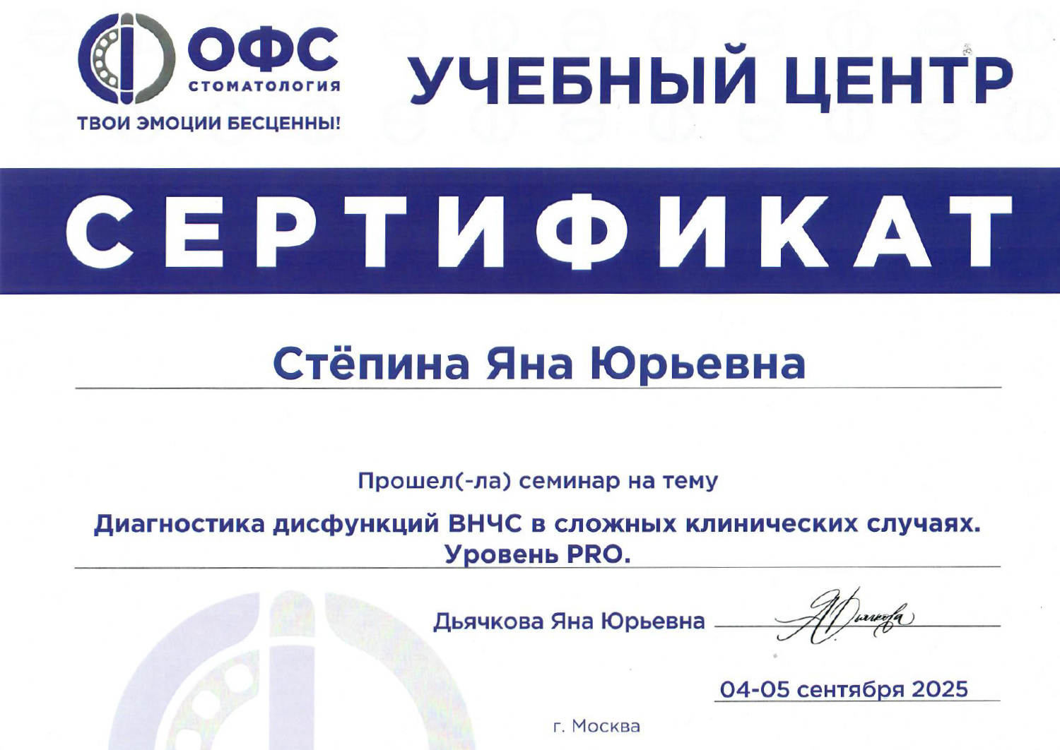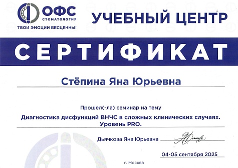 - 2025 г. — ОФС Стоматология, «Диагностика дисфункций ВНЧС в сложных клинических случаях».