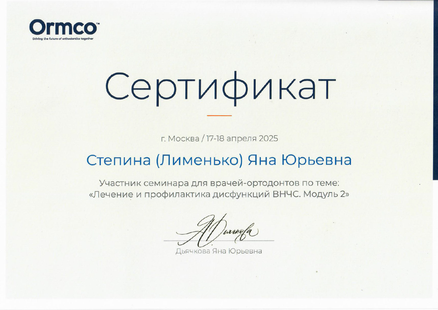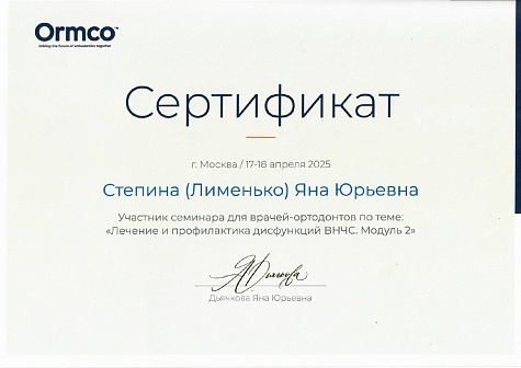 - 2025 г. — Ormco, «Лечение и профилактика дисфункций ВНЧС. Модуль 2».