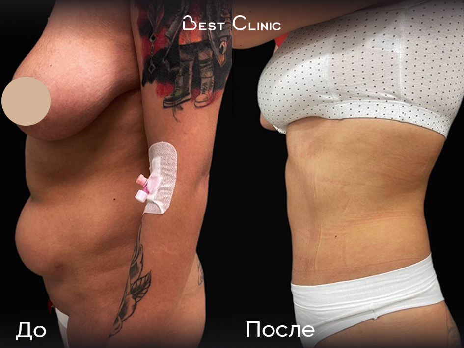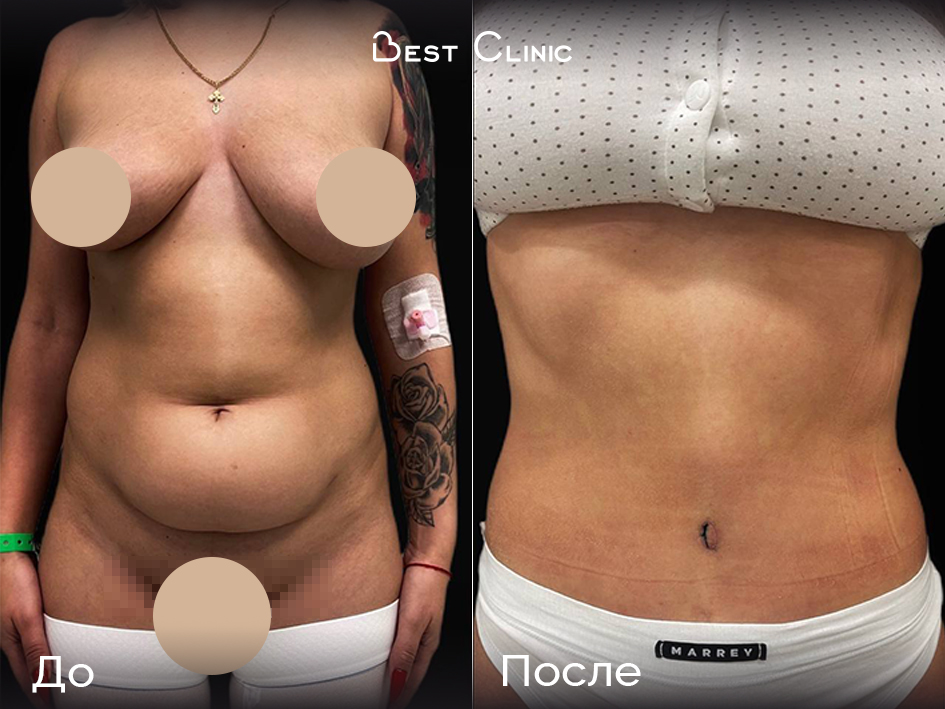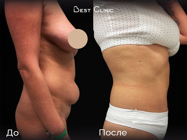 Пациентка обратилась с кожно-жировым фартуком. Выполнена абдоминопластика — форма живота значительно улучшена.