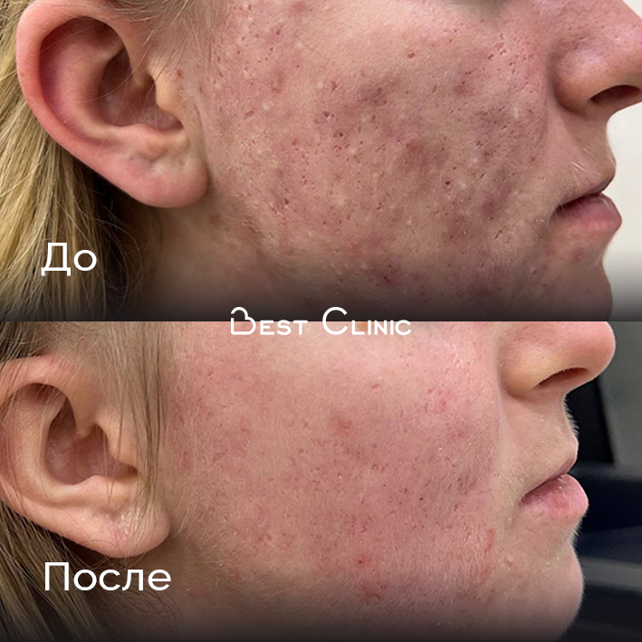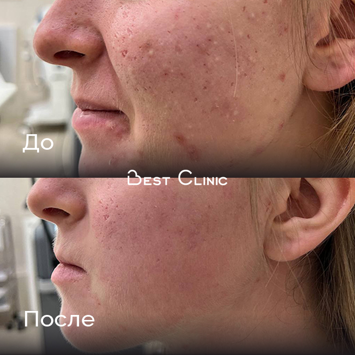 Пациентка обратилась с желанием вылечить кожу от акне. Выполнено лечение с применением системной терапии ретиноидами — состояние кожи улучшено, воспалительные элементы снижены.