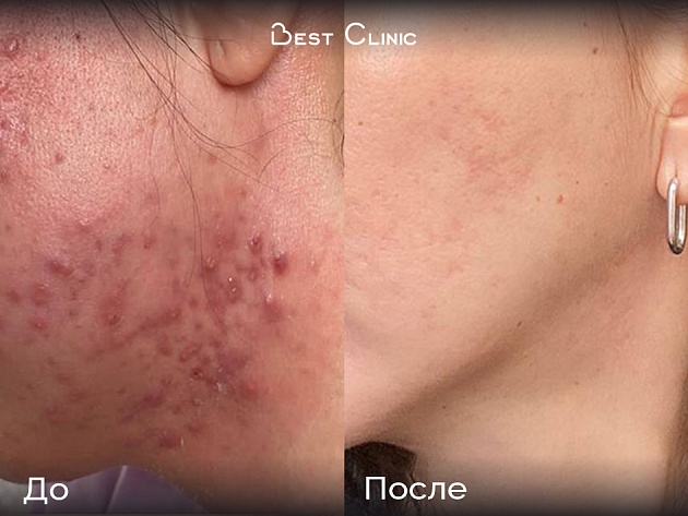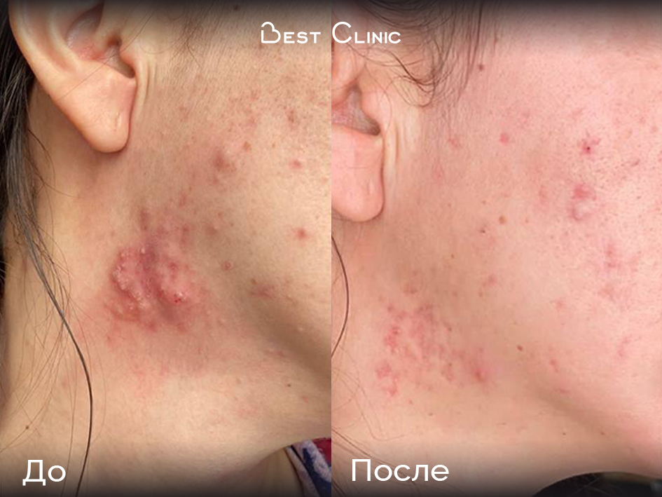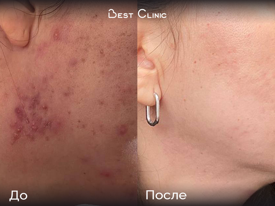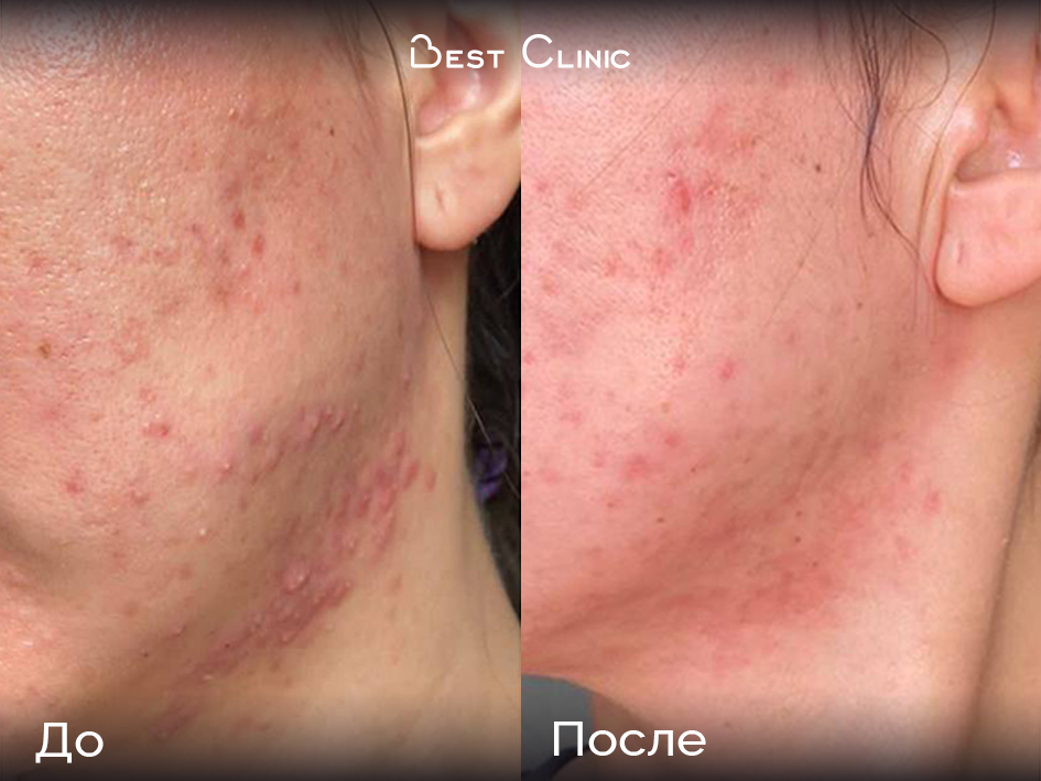 Пациентка обратилась с жалобами на акне. Проведена системная терапия ретиноидами — отмечено уменьшение воспалительных элементов и улучшение состояния кожи.