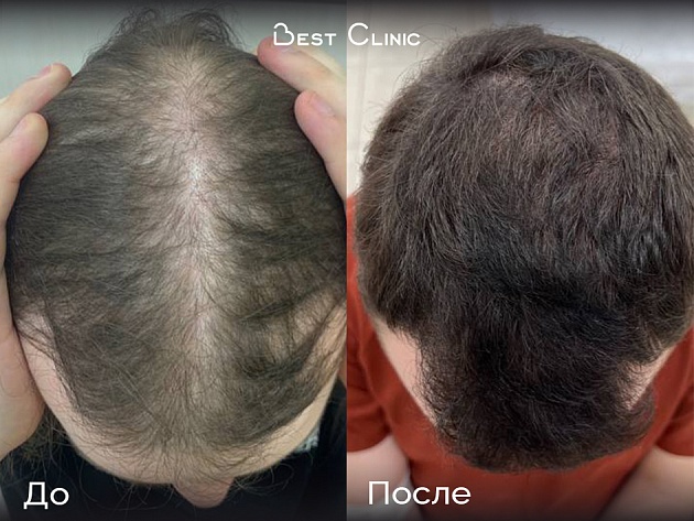 Пациентка обратилась с жалобами на выпадение волос. Диагностирована андрогенная алопеция — проведено лечение с применением местной терапии и инъекций обогащённой плазмы, достигнуто укрепление и утолщение волос.