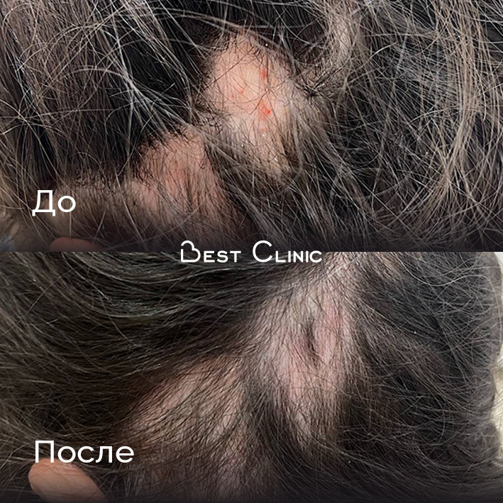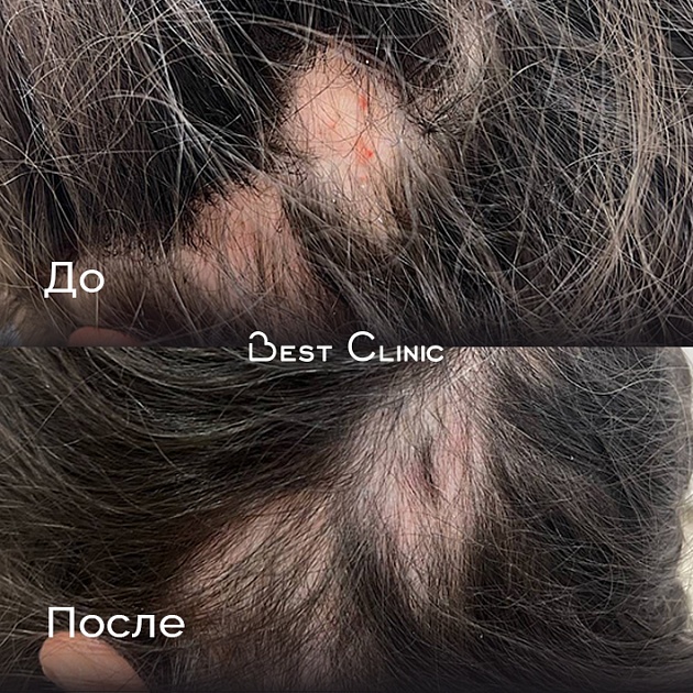 Пациент обратился с жалобами на выпадение волос очагами. Проведено лечение гнездной алопеции, промежуточный этап — отмечено замедление выпадения и начало восстановления волосяного покрова.