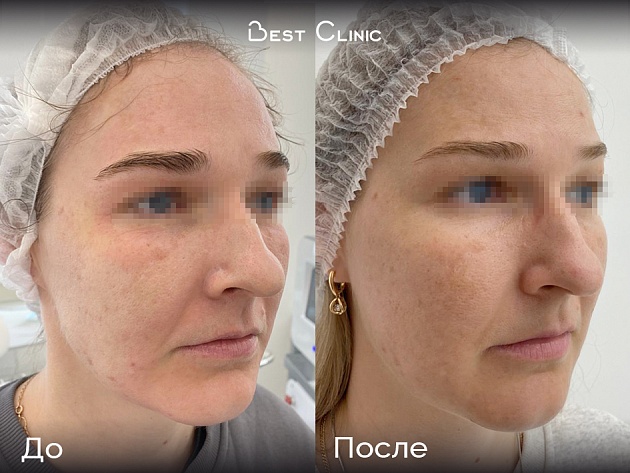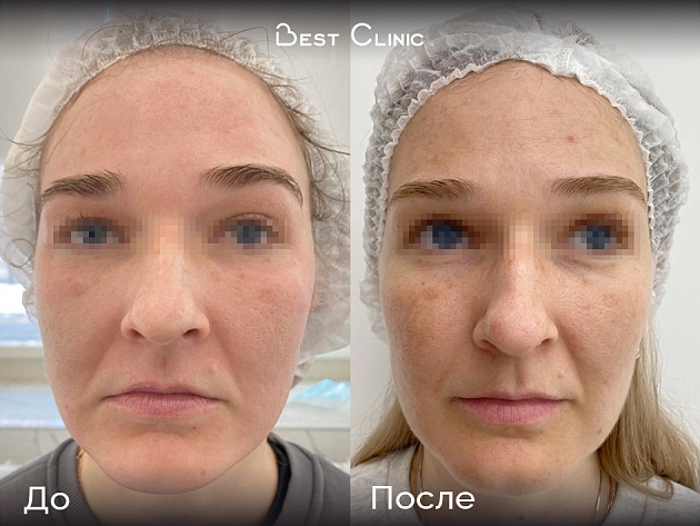 Пациентка прошла одну процедуру микроигольчатого РФ-лифтинга Vivace. Через 4 недели заметно улучшилось качество кожи — стала плотнее, повысилась упругость и тонус, контуры лица стали более чёткими.