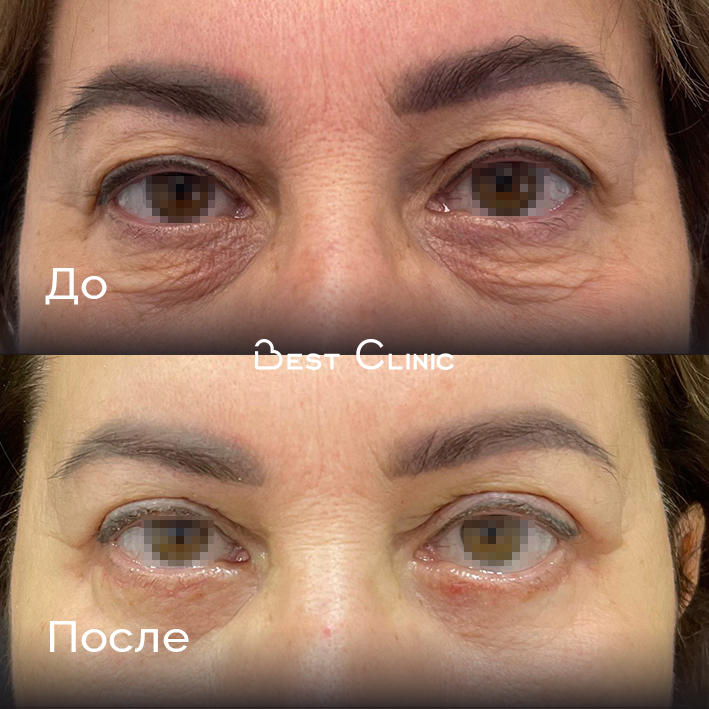Пациентка обратилась с избытками кожи нижних век. Проведена нижняя блефаропластика — область под глазами стала более гладкой и подтянутой.