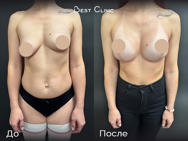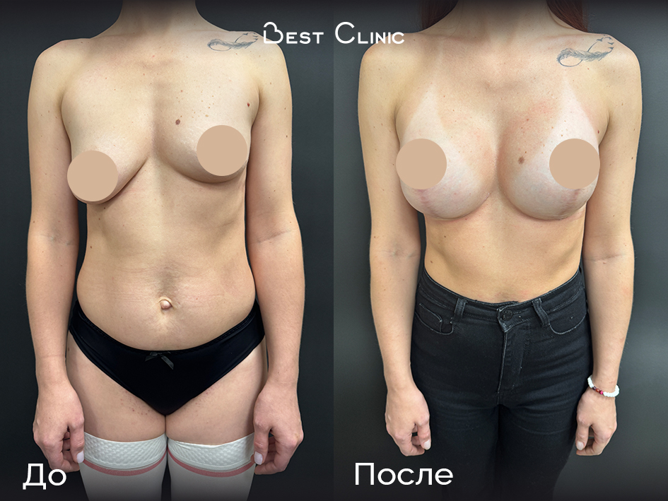 Пациентка обратилась с жалобами на асимметрию и потерю объёма груди после родов и кормления. Выполнено увеличение с подтяжкой и коррекцией асимметрии — форма и объём восстановлены, грудь приобрела естественный вид.