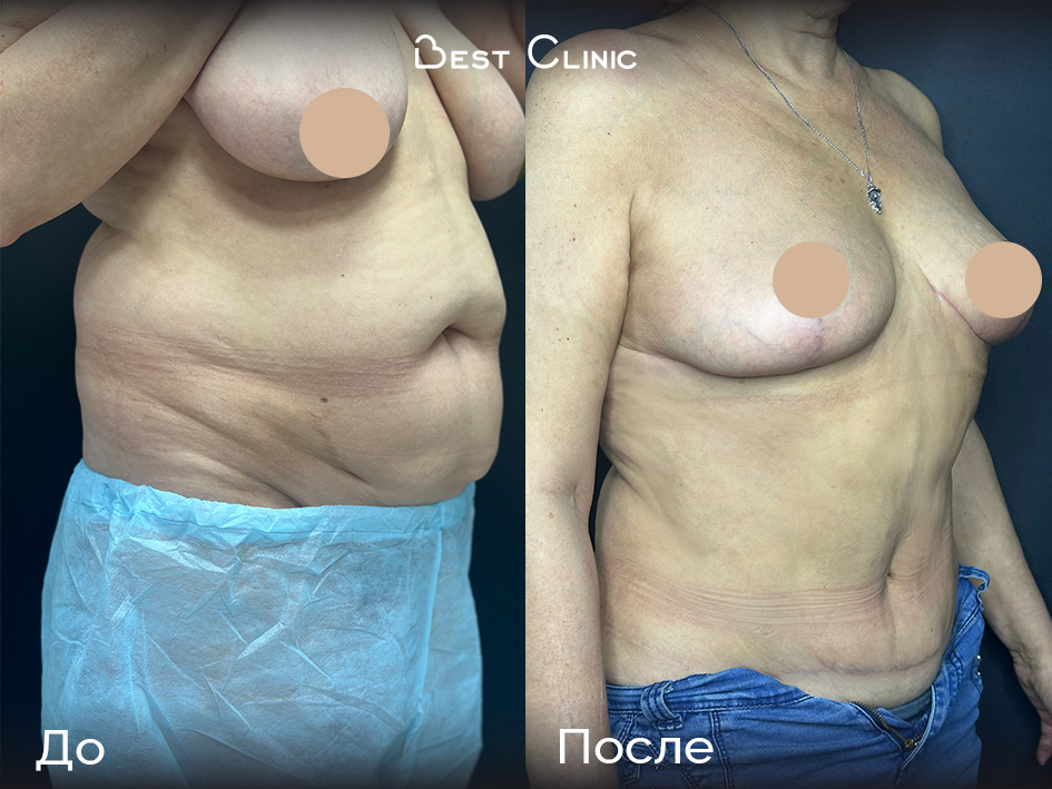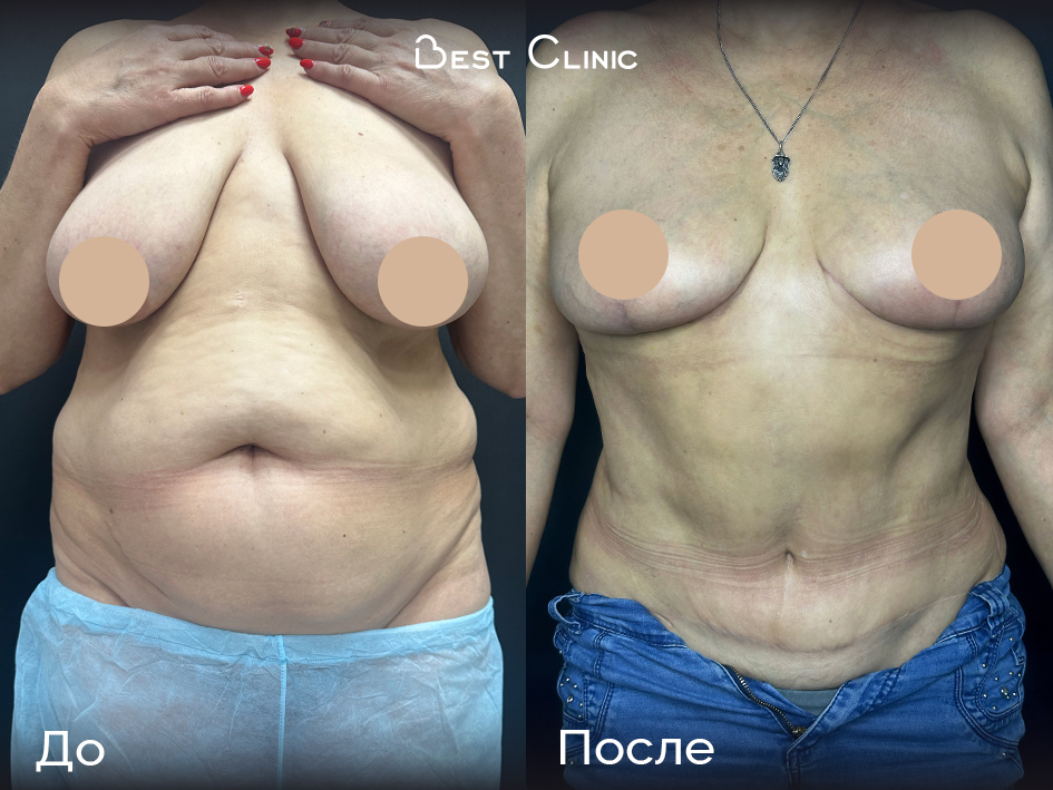 Пациентка обратилась с птозом и большим объёмом молочных желёз, а также неудовлетворённостью формой живота и жировыми отложениями. Выполнена редукционная мастопексия и классическая абдоминопластика с ушиванием диастаза, транспозицией пупка и липосакцией — результат через 3 месяца показывает выраженное обновление контуров тела.