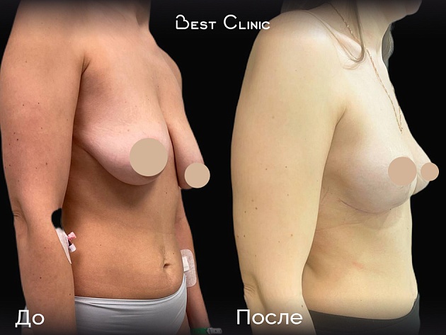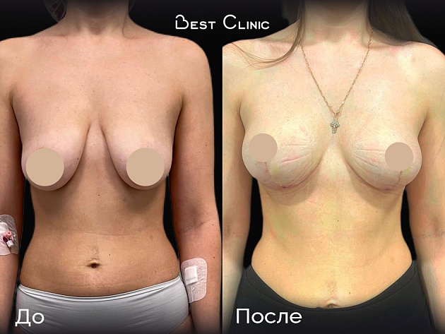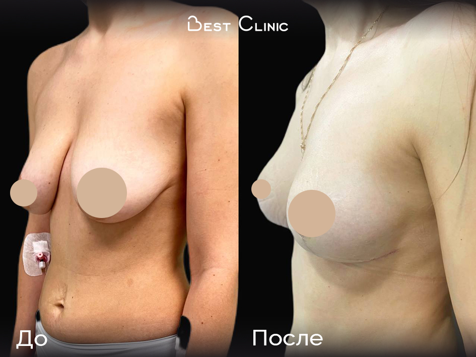 Пациентка обратилась с птозом молочных желез. Выполнена Т-инвертированная мастопексия без имплантов — грудь приобрела более подтянутую и естественную форму.