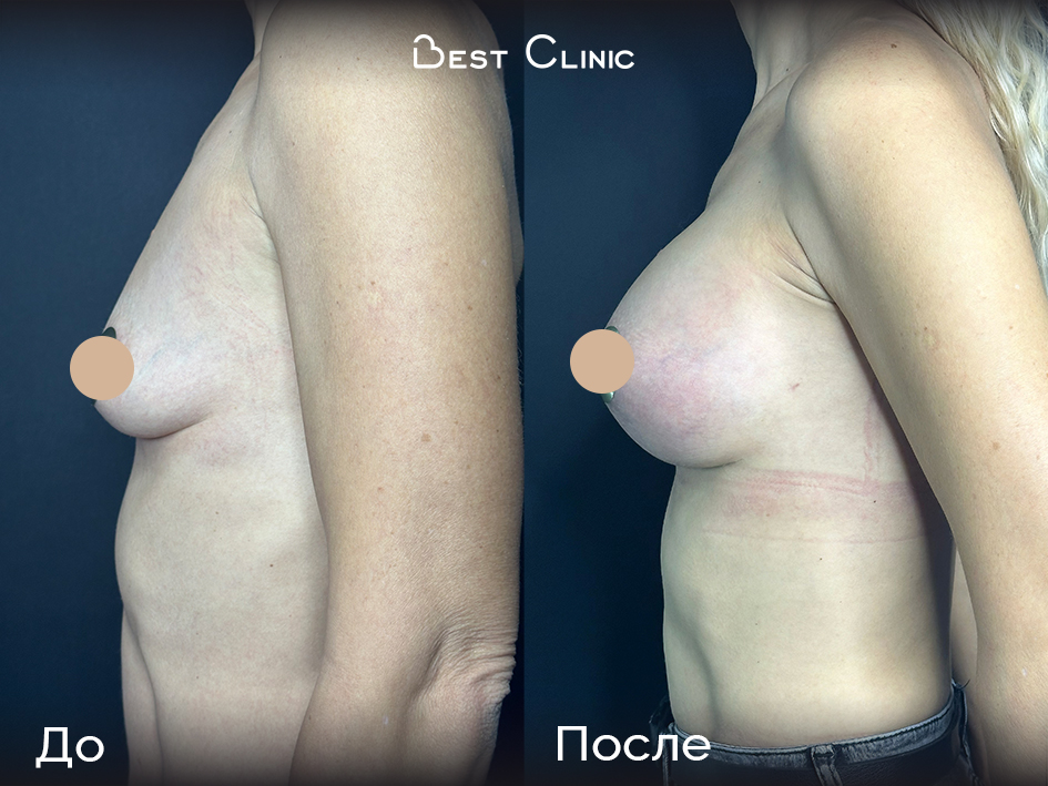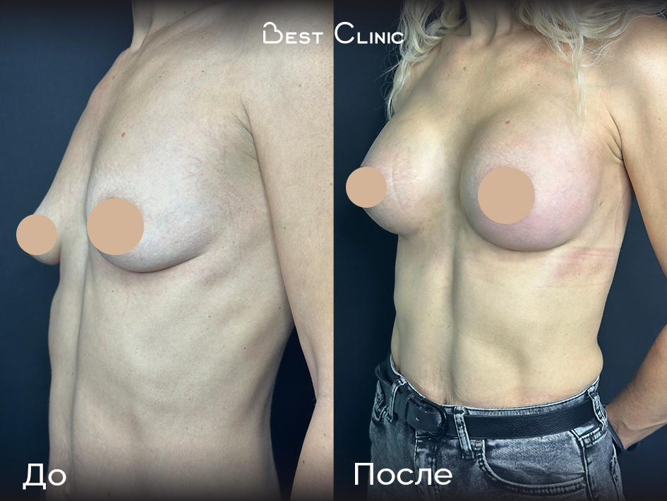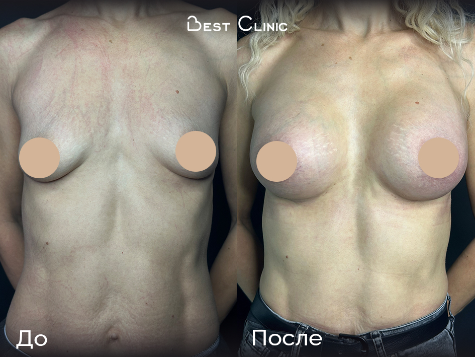 Пациентка обратилась с жалобами на неудовлетворённость формой и объёмом молочных желёз и психологическим дискомфортом. Выполнено увеличение груди анатомическими силиконовыми имплантатами 300 мл с коррекцией тубулярности — форма скорректирована, объём восстановлен.