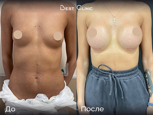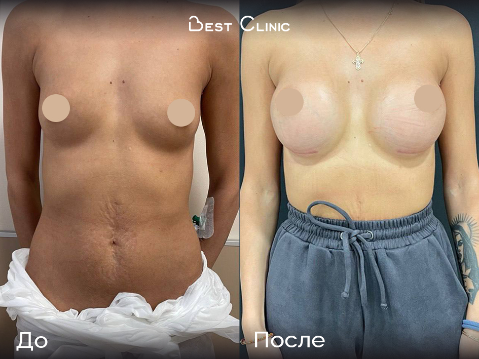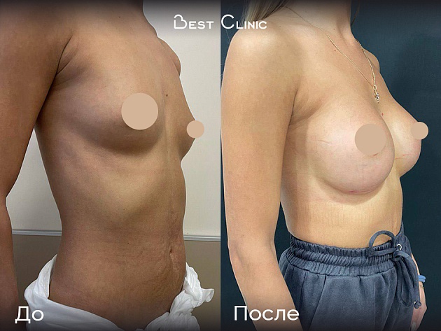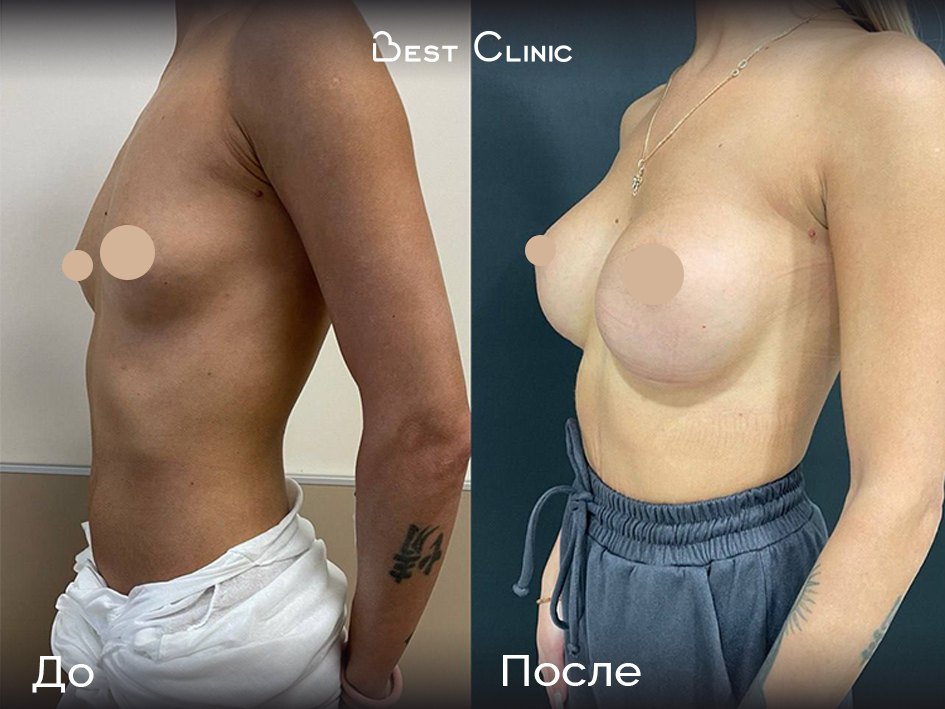 Пациентка обратилась с эстетическим дискомфортом и недостаточным объёмом груди. Выполнено увеличение молочных желез круглыми имплантами — форма стала более гармоничной.
