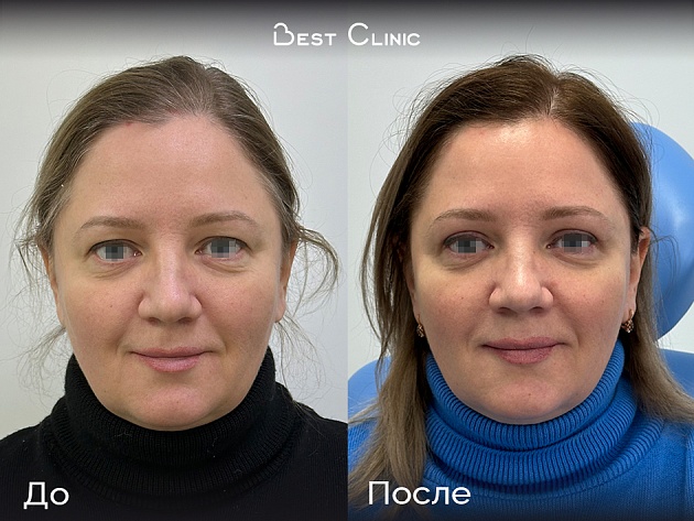 Пациентка обратилась с жалобами на избыток кожи верхних век. Проведена верхняя блефаропластика — удалось раскрыть взгляд и придать лицу более отдохнувший вид.