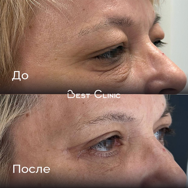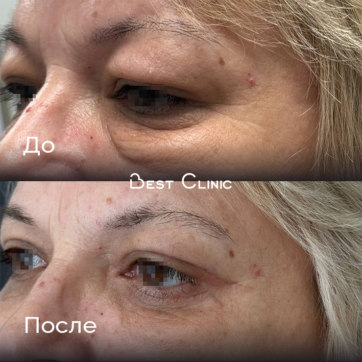 Пациентку беспокоили избытки кожи и жировые грыжи верхних и нижних век. Выполнена верхняя и нижняя блефаропластика — область век омолодилась и стала более аккуратной.